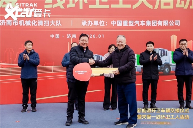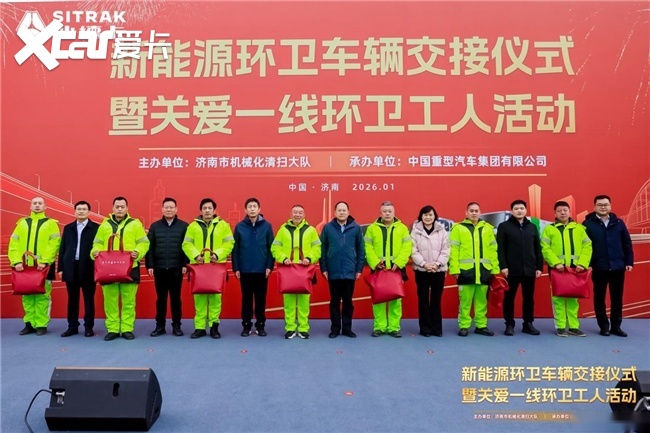 2026年1月14日,“新能源环卫车辆交接典礼暨关爱一线环卫工人活动”在济南机械化打扫大队盛大举办。活动现场完结37辆我国重汽汕德卡新能源环卫车辆交给,并同步打开关爱一线环卫工人暖心举动,政企携手敞开济南环卫作业绿色转型新篇章。